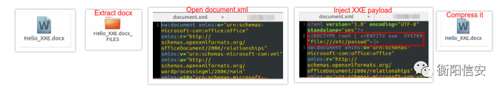 快照4:将XXE payload嵌入到Docx文件中.Docx(就像pptx和xlsx一样)本质上是Open XML(OXML)文件。