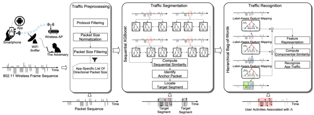 本工作中考虑的攻击者使用WiFi嗅探器捕获加密流量。他的目标是从无线加密流量中识别与目标APP相关的用户活动。根据训练数据集,识别的可以是粗颗粒的信息(即用户在用哪些APP)或细粒的信息(例如,用户如何与这些APP交互)。