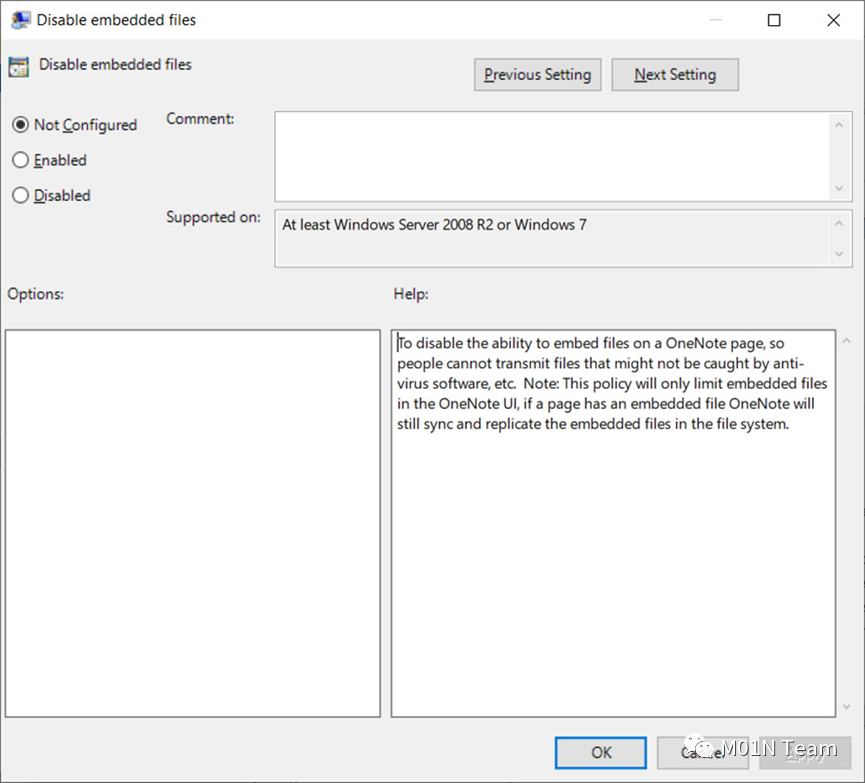 通过配置组策略“Embedded Files Blocked Extensions”,可以指定默认阻止的OneNote附件文件类型,限定附件的文件类型能够在尽可能少地影响正常功能的前提下很好地限制恶意文件的出现。组策略对应的注册表键值为:[HKEY_CURRENT_USER\SOFTWARE\Policies\Microsoft\office\16.0\onenote\options\embeddedfileopenoptions]