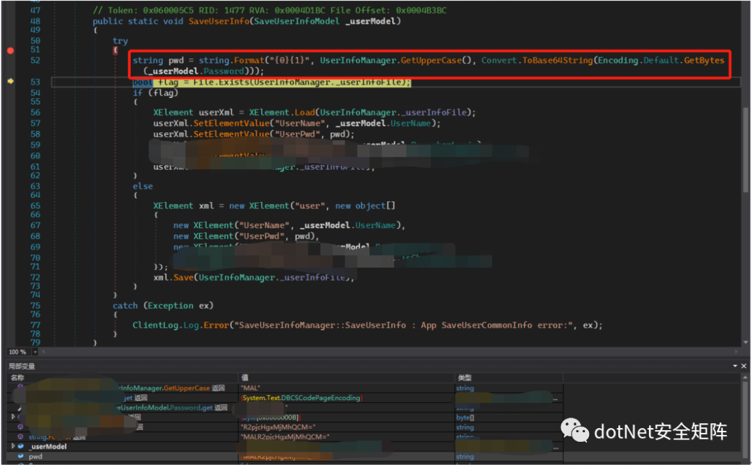 跟踪登录运行的步骤,确定在GetUpperCase方法里生成三位随机字符并转换成大写,并且在密码base64编码后添加到起始位置,最后在SaveUserInfo方法内将账密等信息保存到xml文件内
