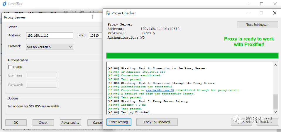 Windows可以用Proxifier、SocksCap,以Proxifier为例,Profile->Proxy Servers->Add,输入物理机内网Socks代理192.168.1.110:10810即可,代理规则自行设置,这里我只是检查通不通。