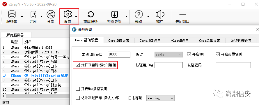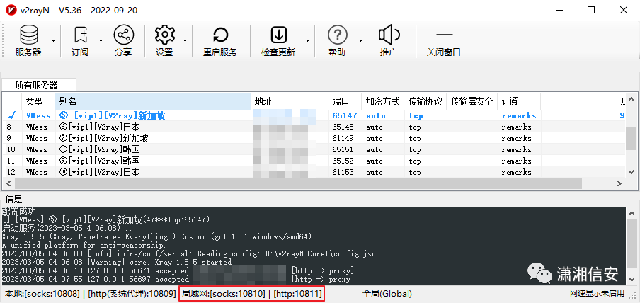项目地址:https://github.com/2dust/v2rayN这时软件界面的底部会显示局域网的socks/http代理端口socks:10810、http:10811,命令行下可以看到0.0.0.0开启了这两个端口。