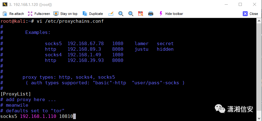 Kali或其他Linux可以用ProxyChains,编辑ProxyChains配置文件,输入i进入插入模式,在ProxyList下添加我们的socks5代理,编辑完成后按Esc键退出编辑模式,输入:wq并回车保存即可。