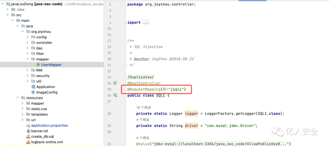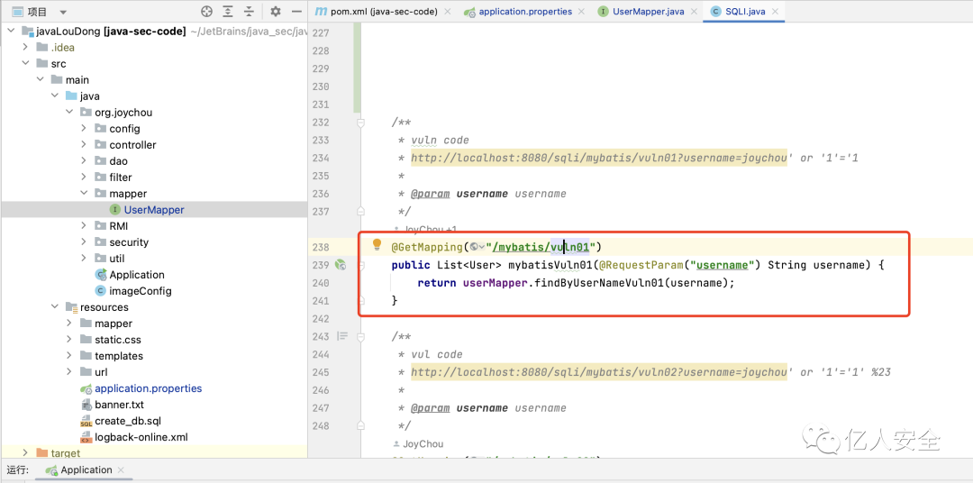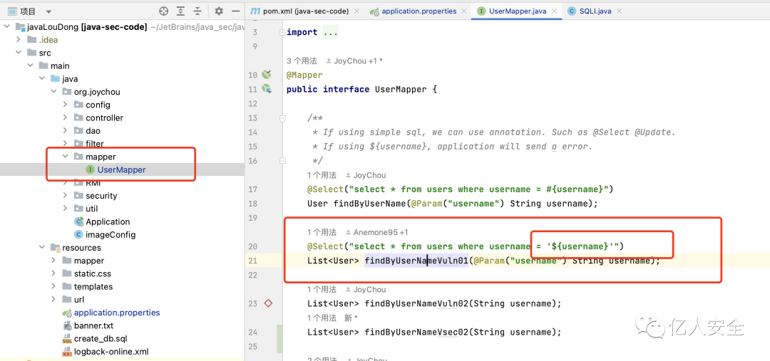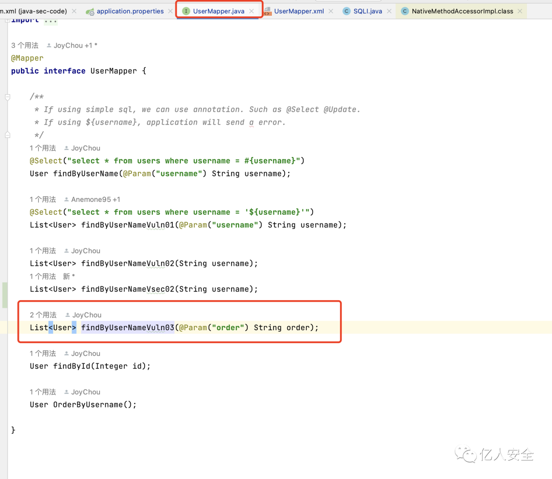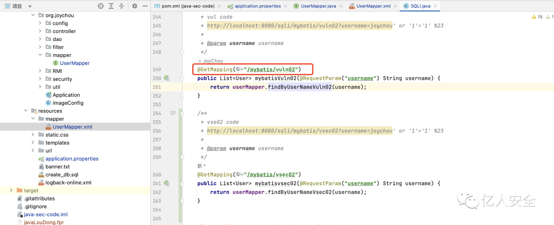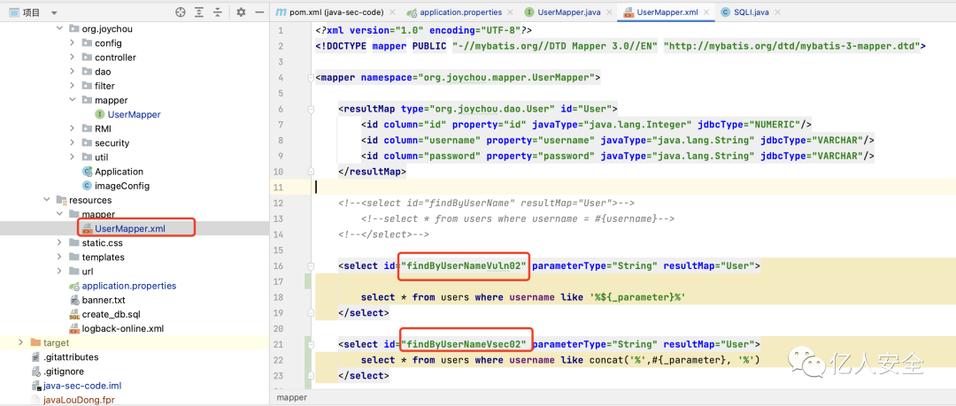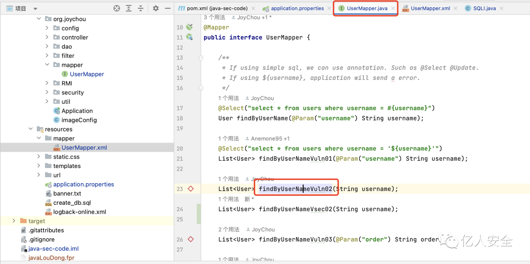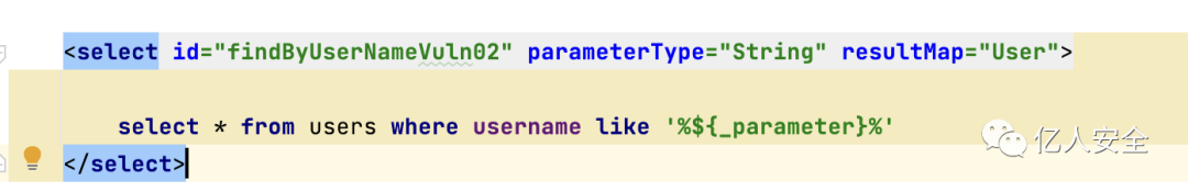可以看到findByUserNameVuln02、findByUserNameVsec02两个方法都是以这种方式配置的sql语句,在Mapper中跟进findByUserNameVuln02方法