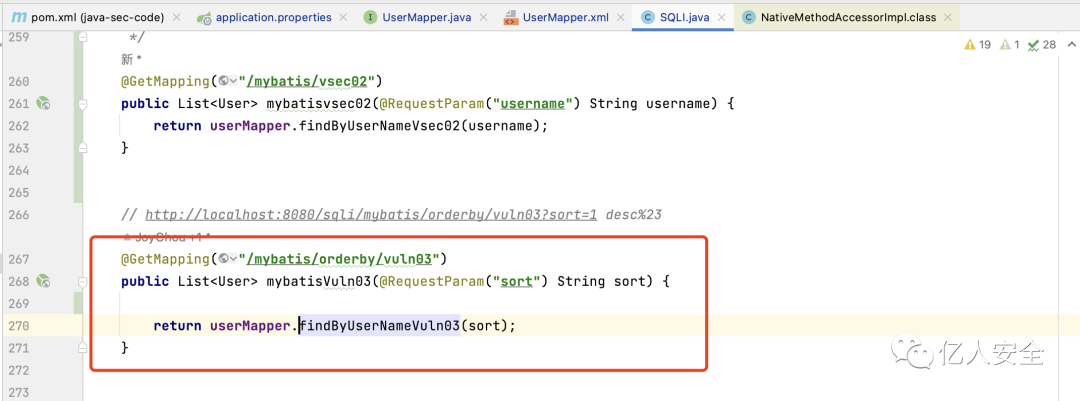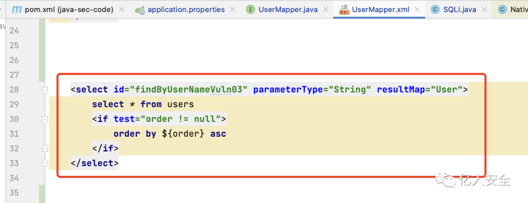 在xml配置文件中观察findByUserNameVuln03使用order by排序方法构造sql语句,可以看到如果order值不为空走进排序查询语句