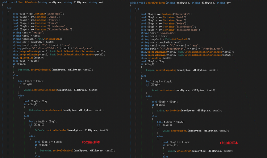 在SearchProducts函数中,先判断比较是何种杀软,以此来决定以何种方式来启动后续载荷。