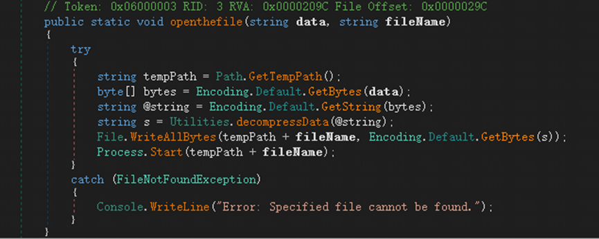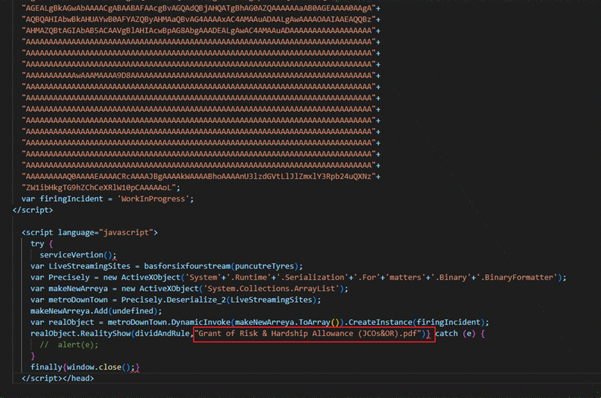其主要功能是内存中加载DLL,并通过DLL中的函数解密JS代码中嵌套的数据,从而释放诱饵PDF文件。
