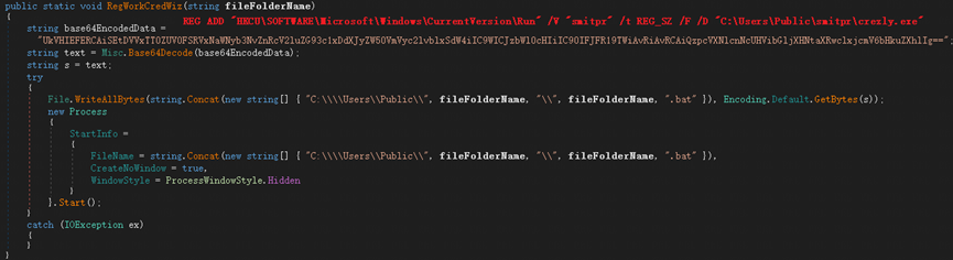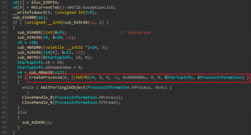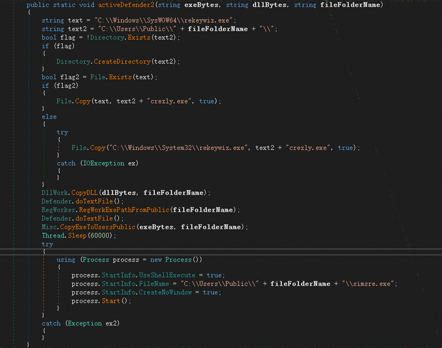 当杀软为Kaspersky、Avast、Bitdefender、WindowsDefender或者其它时,其恶意组件释放方式与印度杀软Quick时基本相同,不同之处在于会休眠一分钟后直接启动释放的simsre.exe程序,并且注册表添加自启动项的程序也是simsre.exe。