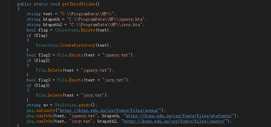 创建C:\ProgramData\HP目录,访问C2下载数据解密后保存在C:\ProgramData\HP\jquery.hta和C:\ProgramData\HP\jscy.hta文件中并执行。