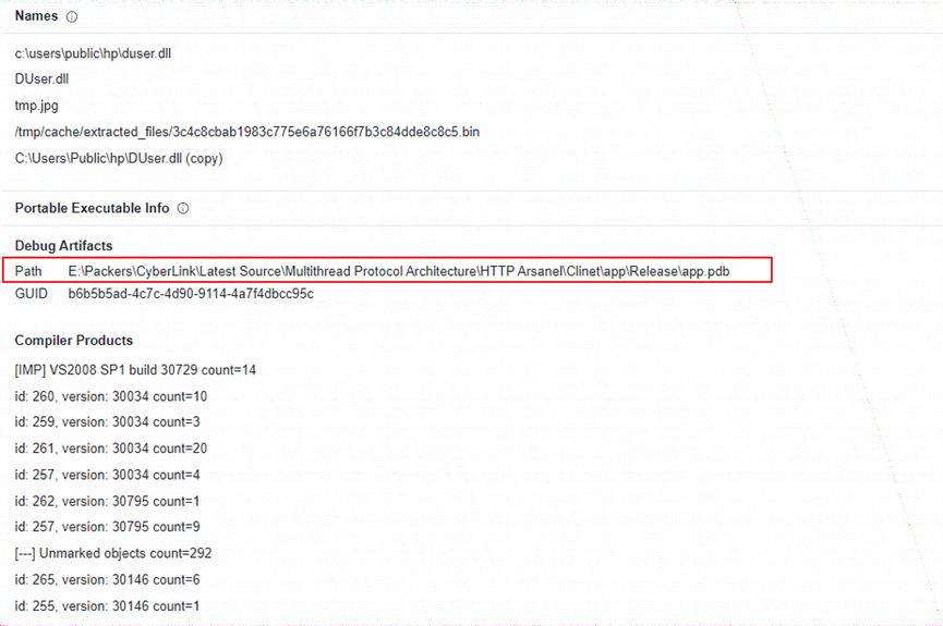 其执行流程与上述分析基本一致,不同的是其最终载荷DUser.dll为C++语言编写的程序,其在Virustotal上的免杀率颇高,其C2为144.91.72.17:8080,并且还携带了PDB路径。