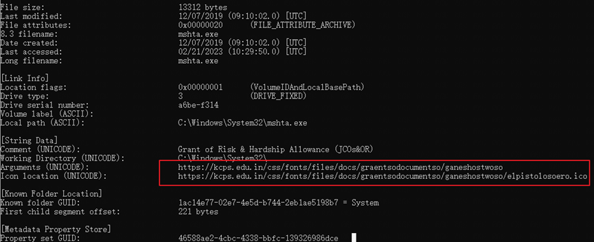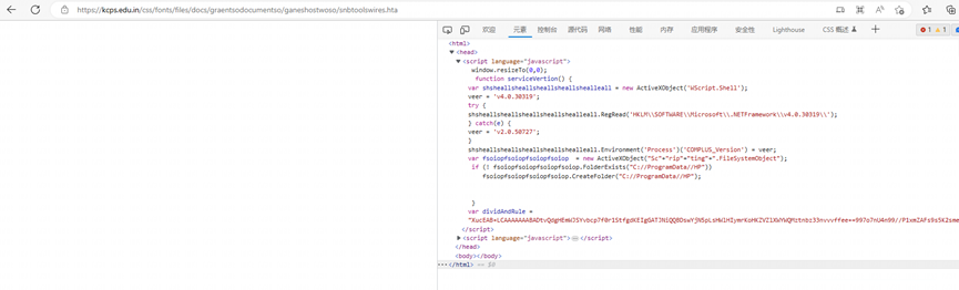 访问lnk中的链接,会跳转到https://kcps.edu.in/css/fonts/files/docs/graentsodocumentso/ganeshostwoso/snbtoolswires.hta下载一段JS代码回来执行。