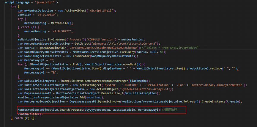 下载的hta文件与阶段一类似,内存中加载DLL,先使用WMI收集系统中的杀软信息,再将硬编码的数据、杀软信息作为参数调用执行DLL中的SearchProducts函数。