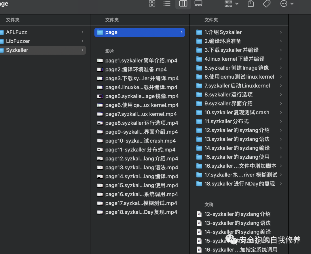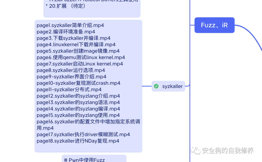 page1.syzkaller简单介绍.mp4page2.编译环境准备.mp4page3.下载syzkaller并编译.mp4page4.linuxkernel下载并编译.mp4page5.syzkaller创建Image镜像.mp4page6.使用qemu测试linux kernel.mp4page7.syzkaller启动Linux kernel.mp4page8.syzkaller运行选项.mp4page9-syzkaller界面介绍.mp4page10-syzkaller复现测试crash.mp4page11-syzkaller分布式.mp4page12.syzkaller的syzlang介绍.mp4page13.syzkaller的syzlang语法.mp4page14.syzkaller的syzlang编译.mp4page15.syzkaller的syzlang使用.mp4page16.syzkaller的配置文件中增加指定系统调用.mp4page17.syzkaller执行driver模糊测试.mp4page18.syzkaller进行NDay复现.mp4