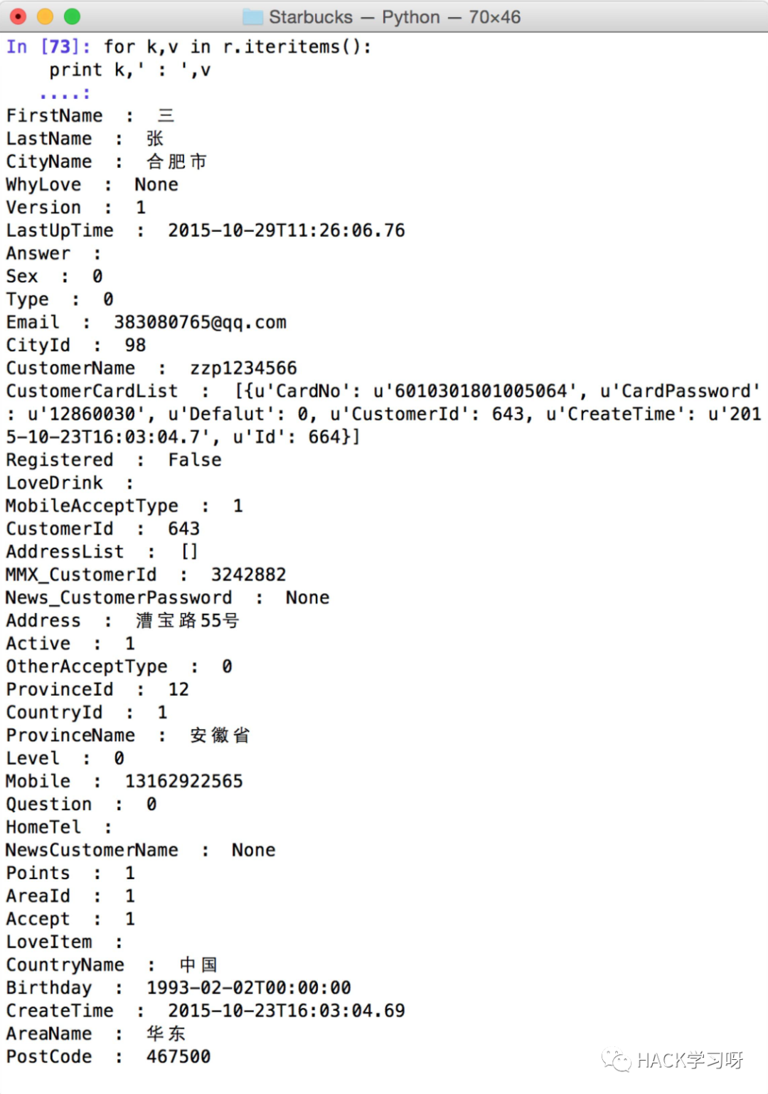{u'Accept': 1,u'Active': 1,u'Address': u'ss,ssss',u'AddressList': [],u'Answer': u'',u'AreaId': 6,u'AreaName': u'\u897f\u5317',u'Birthday': u'1989-02-26T00:00:00',u'CityId': -1,u'CityName': None,u'CountryId': 1,u'CountryName': u'\u4e2d\u56fd',u'CreateTime': u'2014-05-27T11:06:00.183',u'CustomerCardList': [{u'CardNo': u'6010581801781836',u'CardPassword': u'15840030',u'CreateTime': u'2014-05-23T15:07:55.707',u'CustomerId': 148,u'Defalut': 0,u'Id': 148},{u'CardNo': u'6010582556865337',u'CardPassword': u'25535122',u'CreateTime': u'2014-05-27T11:06:00.197',u'CustomerId': 148,u'Defalut': 0,u'Id': 169}],u'CustomerId': 148,u'CustomerName': u't2556865337',u'CustomerPassword': u'123456',u'Email': u'[email protected]',u'FirstName': u'Ws',u'HomeTel': u'',u'LastName': u'Ws',u'LastUpTime': u'2014-05-30T16:27:03.417',u'Level': 2,u'LoveDrink': u'',u'LoveItem': u' ',u'MMX_CustomerId': 3237670,u'Mobile': u'11111111111',u'MobileAcceptType': 0,u'NewsCustomerName': None,u'News_CustomerPassword': None,u'OtherAcceptType': 0,u'Points': 39,u'PostCode': u'222222',u'ProvinceId': 31,u'ProvinceName': u'\u65b0\u7586\u7ef4\u543e\u5c14\u81ea\u6cbb\u533a',u'Question': 0,u'Registered': False,u'Sex': 0,u'Type': 0,u'Version': 0,u'WhyLove': None}
