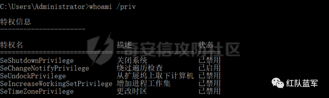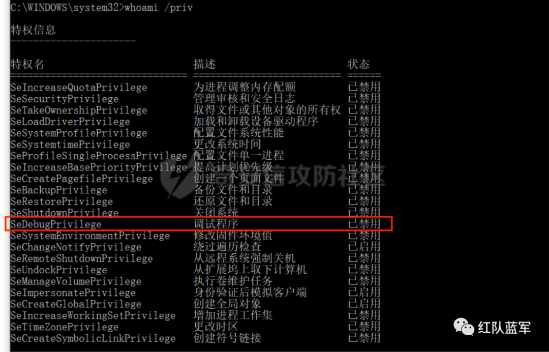 我们以普通用户开启一个cmd窗口进行查看,发现并没有找到SeDebugPrivilege