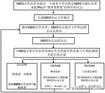 依据官方定义, 生物监测情报体系主要包含“扫描和识别环境”“收集与整合基础信息”“发布和推送预警”“风险预测与决策建议”四大核心业务流程。 为了切实推进生物监测战略“落地见效”,美国政府又随后颁布《生物监测集成中心战略规划》作为生物监测战略的工作指南和实施细则。如表 1 所示,由于美国生物反恐预警情报体系的“组织要素”涉及多达17个联邦机构, 为了保证生物监测集成中心( NBIC,National Biosurveillance Integration Center)负责运营的生物监测集成系统( NBIS, National Biosurveillance Integration System)能够在美国庞杂的情报与安全体系中实现资源共享和业务集成, 保持生物反恐预警情报体系的“一体化”效能,战略规划中还详细制定了名为“生物监测集成系统工作协议流程”(NBISProtocol Flow Chart)的工作协调机制。(见图 4)