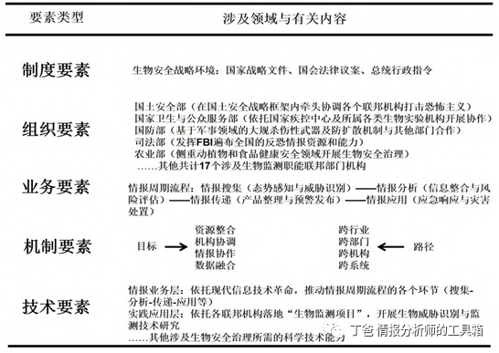 基于图 2 情报战略框架,结合图3结构关系,美国生物反恐预警情报体系是一个复杂系统性工程,其中各要素的具体内涵构成参见下表: