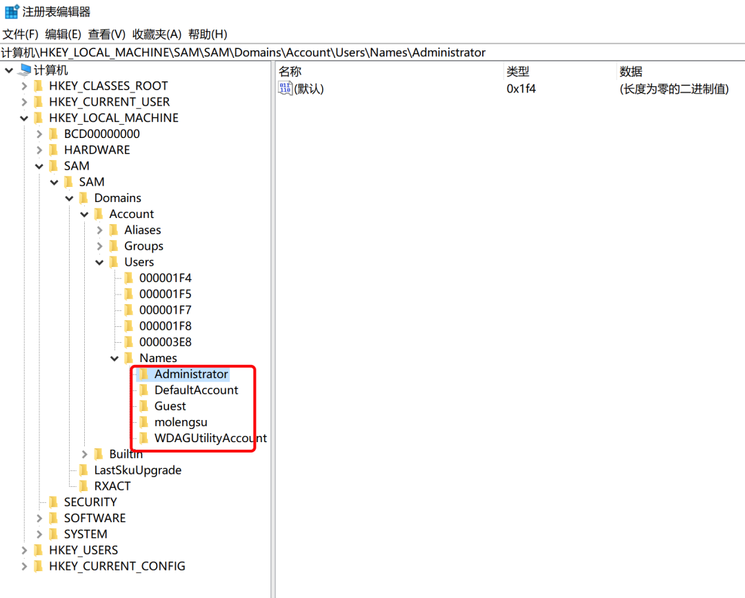 检查注册表计算机\HKEY_LOCAL_MACHINE\SAM\SAM\Domains\Account\Users\Names中是否有隐藏的账户,通过注册表进行建立的隐藏账户无法在计算机管理中进行查看,隐蔽性极高。在排查隐藏账户时可进行查看是否有相关可疑账户。发现确认可疑账户可右击进行删除。