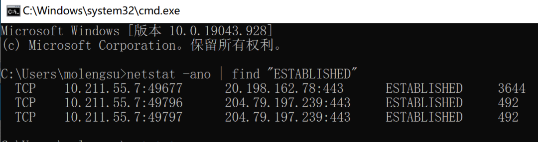 netstat -ano | find "ESTABLISHED"  查看网络建立连接的状态