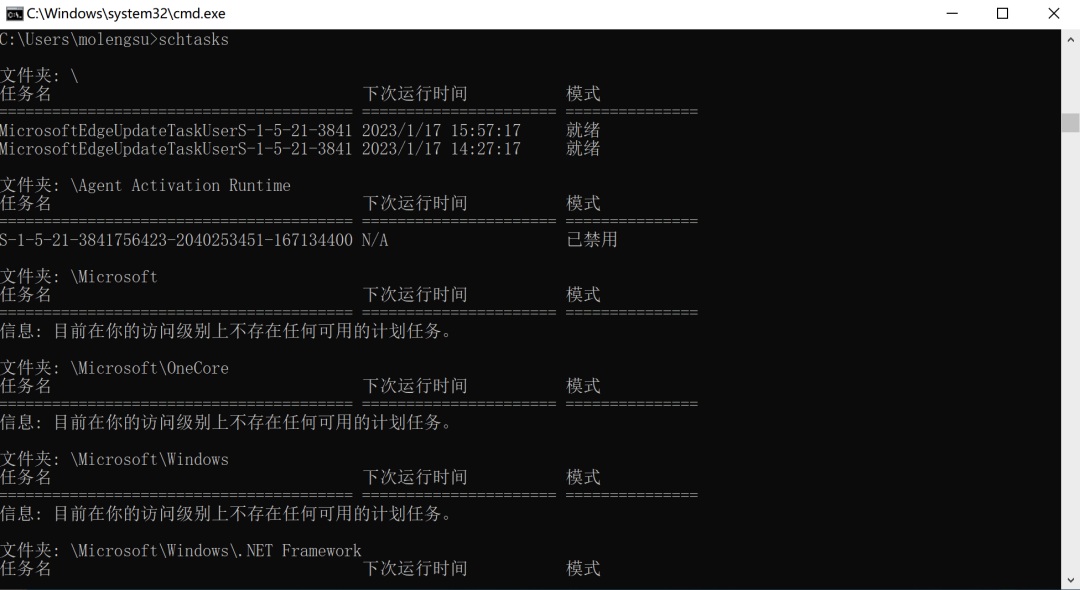 在使用schtasks命令可以对计划任务进行管理,直接输入schtasks可以查看当前计算机中保存的计划任务。