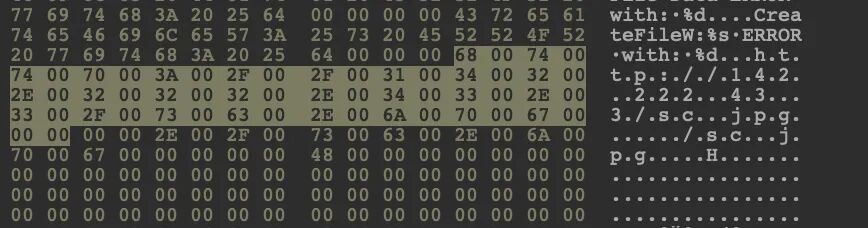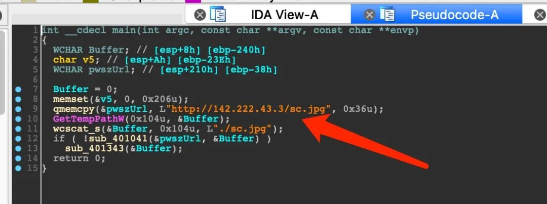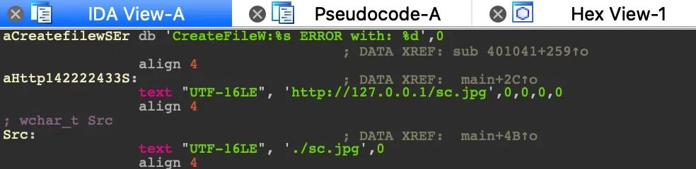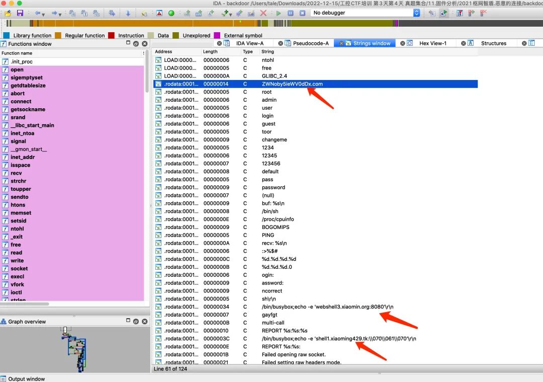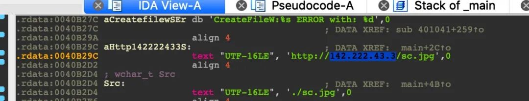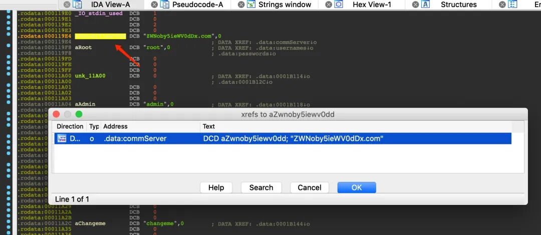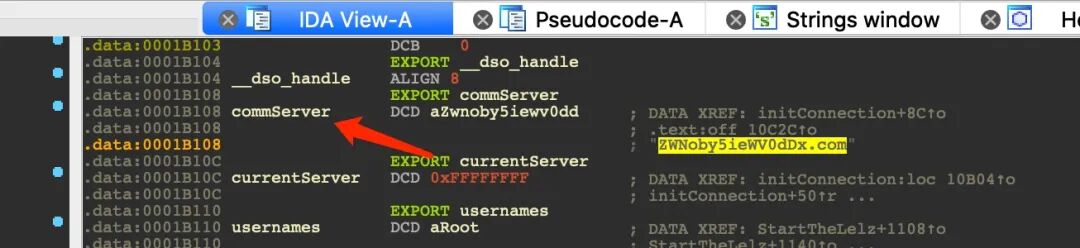 再次放入ida后shift+F12查看字符串,发现存在域名的3个地址