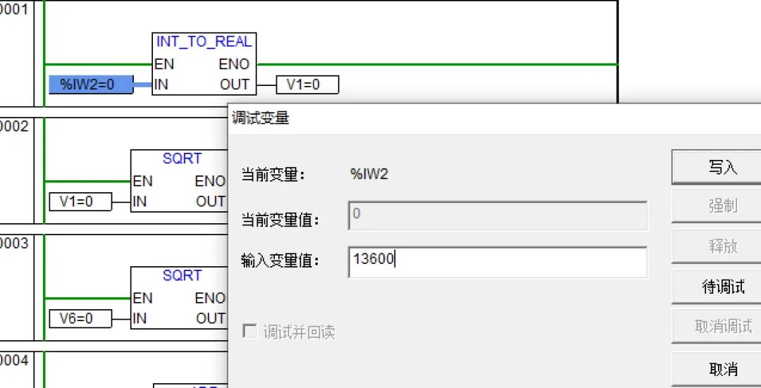然后点击仿真和运行并根据题目将IW2的值输入13600