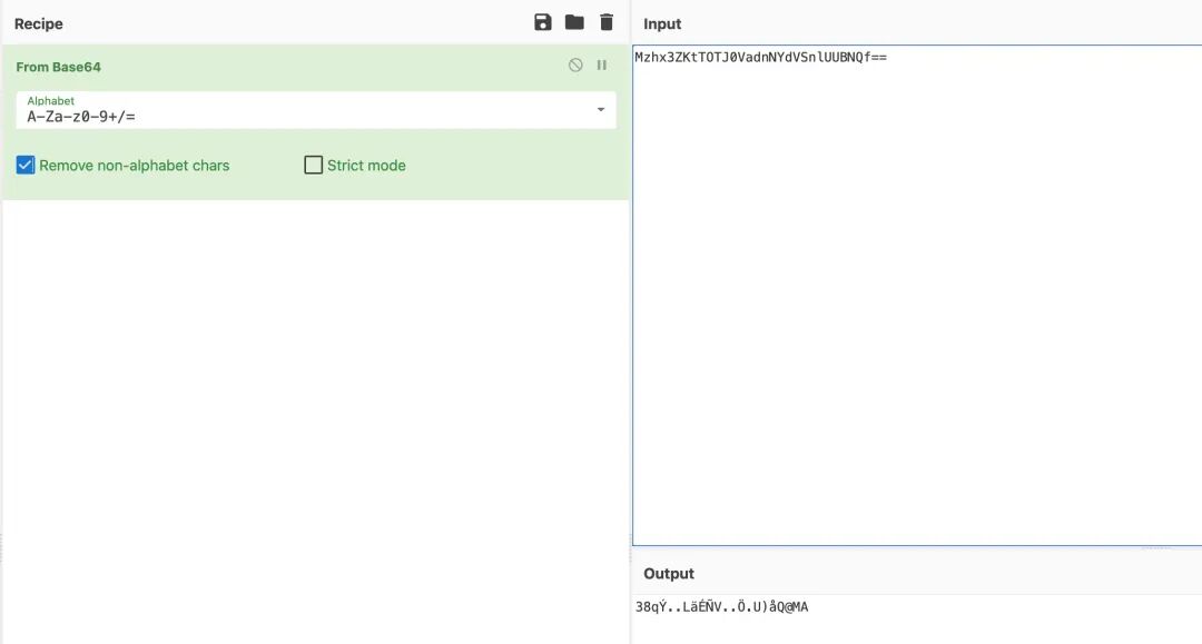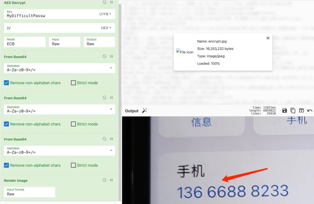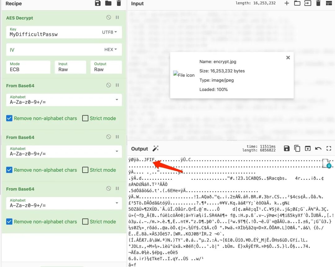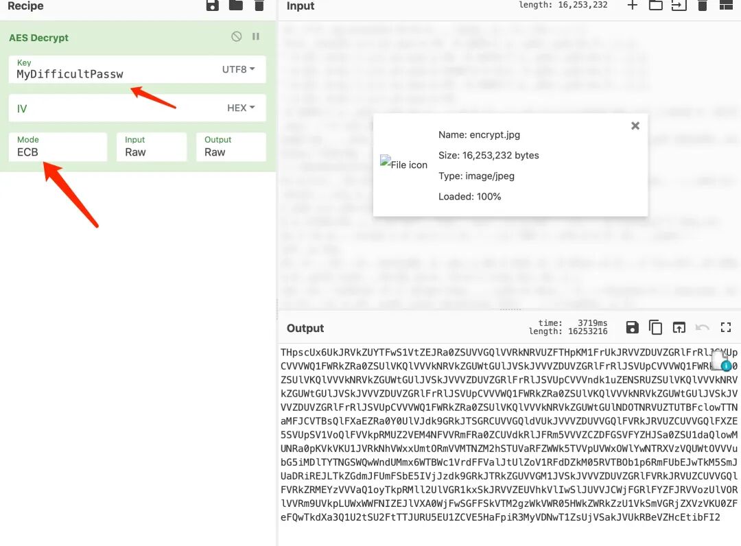 然后将加密后的图片encrypt.jpg放入cyberchef,输入APK里的aes_key MyDifficultPassw 因未发现IV,选择空,mode选择ECB(没有偏移)。输出后,先查看1字节文件内容