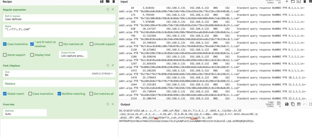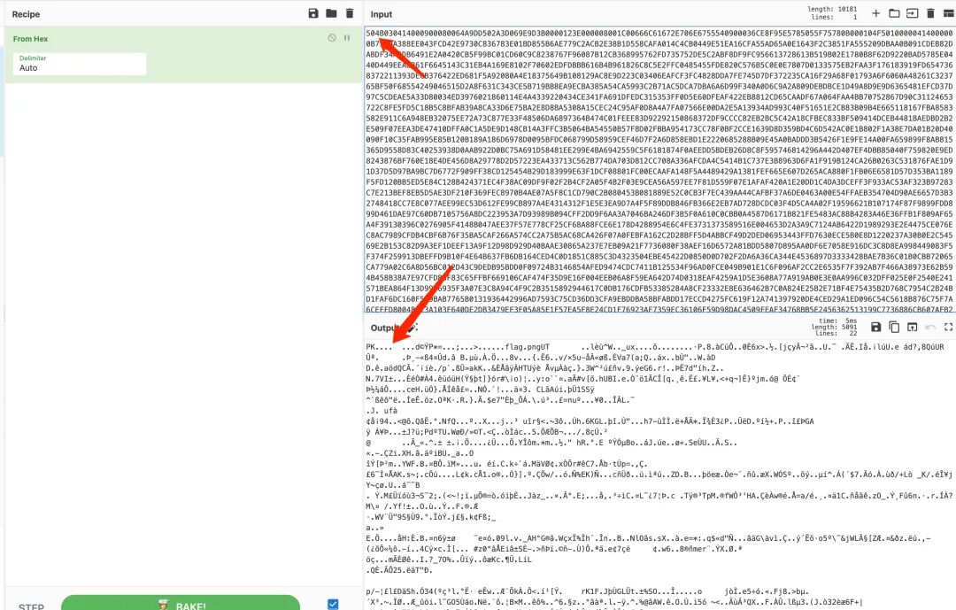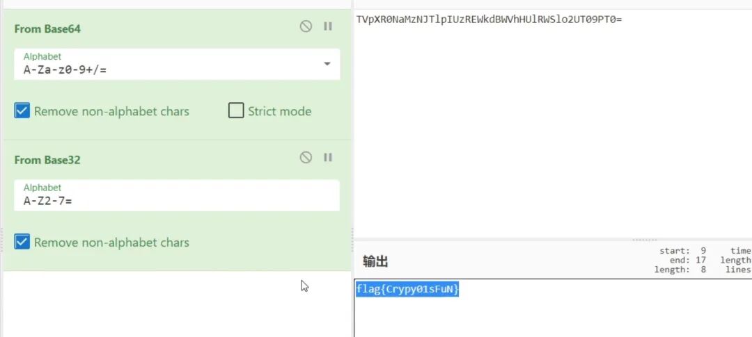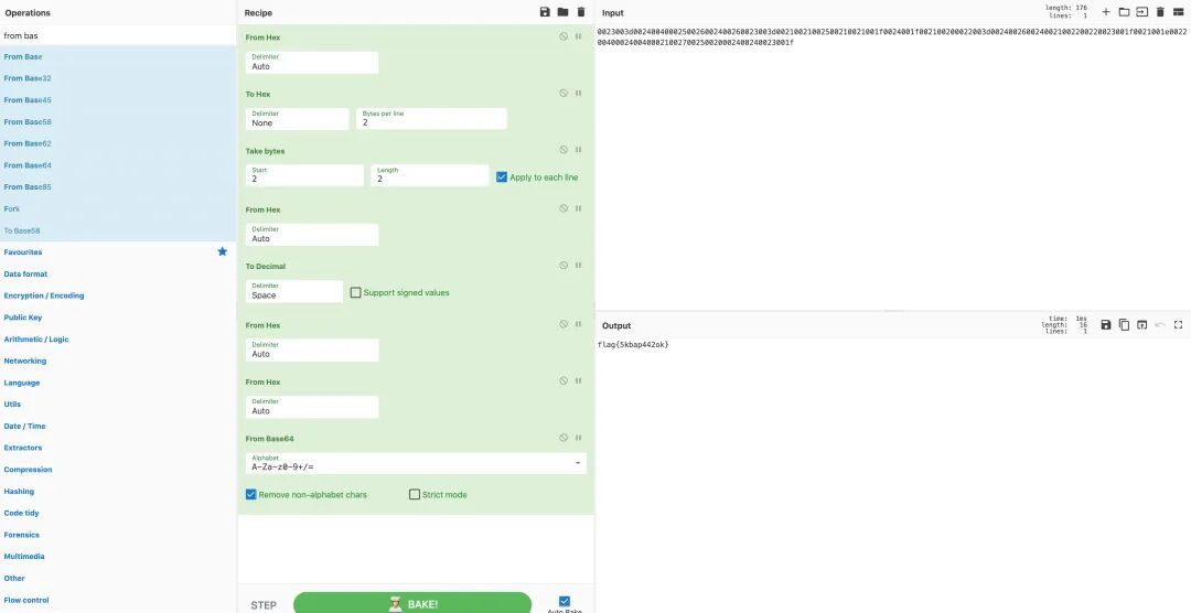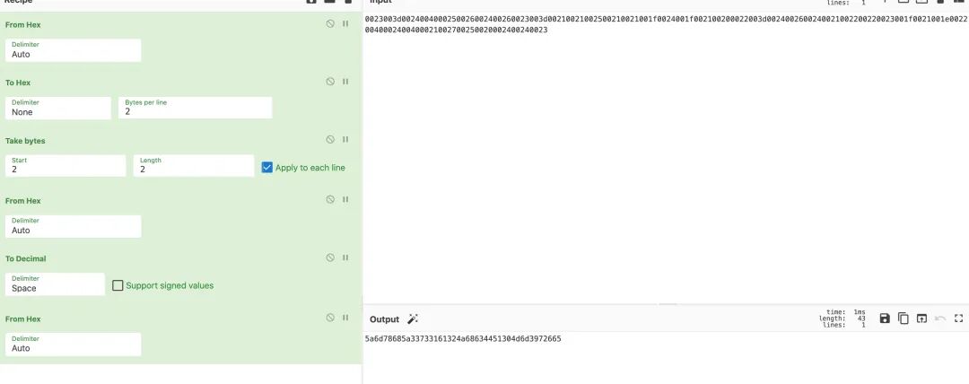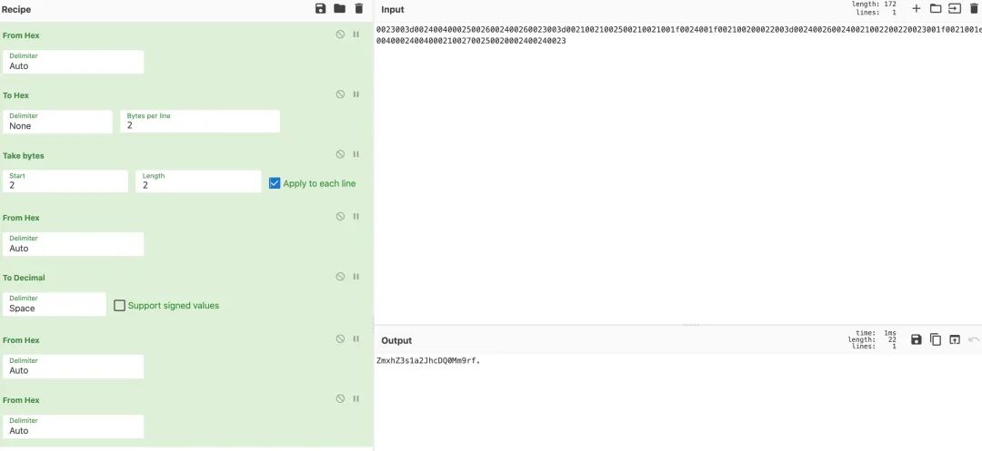 第七步:得到的5a6d78685a33733161324a68634451304d6d3972665疑似16进制字符串,然后再进行hex解码得到ZmxhZ3s1a2JhcDQ0Mm9rf.
