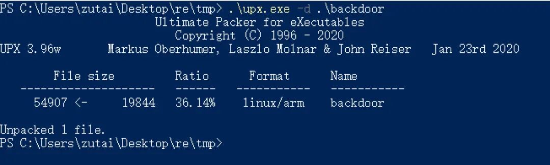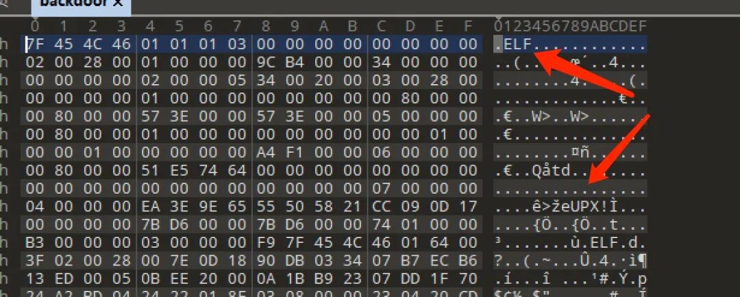 导入010发现为ELF格式文件, 将该文件导入ida发现函数特别少,怀疑是加了壳。 然后再导入010发现upx关键字