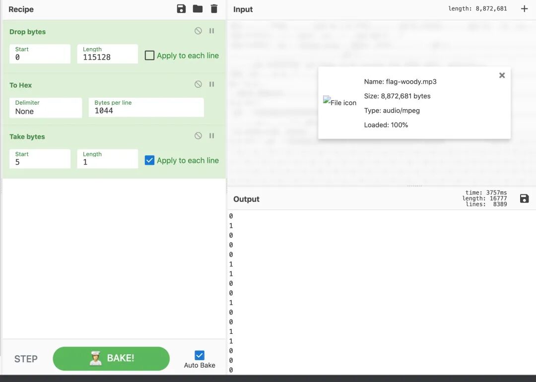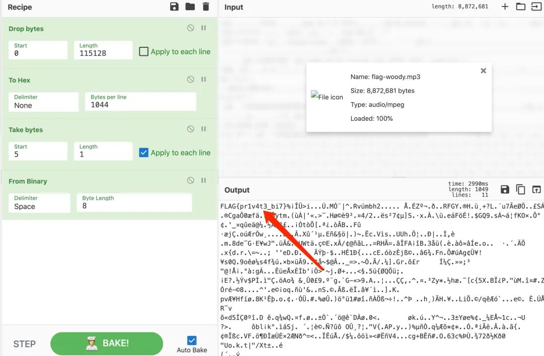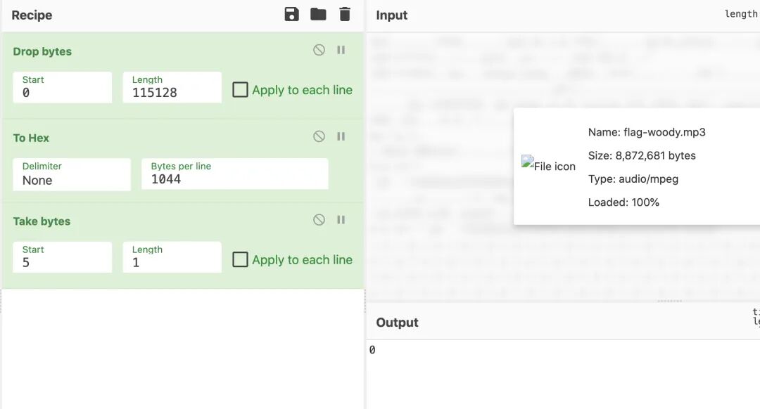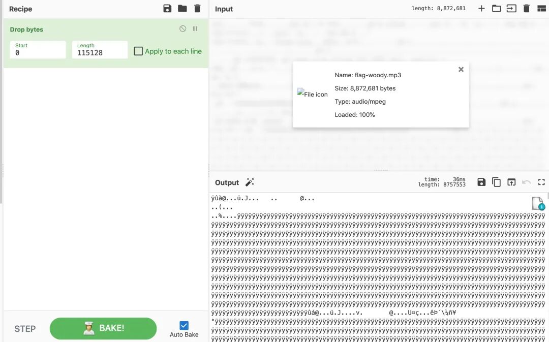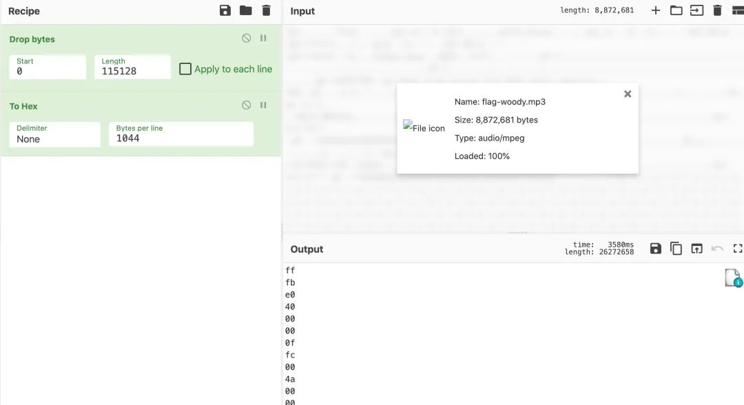 2、将该mp3文件拖入cyberchef删除0到115128bytes