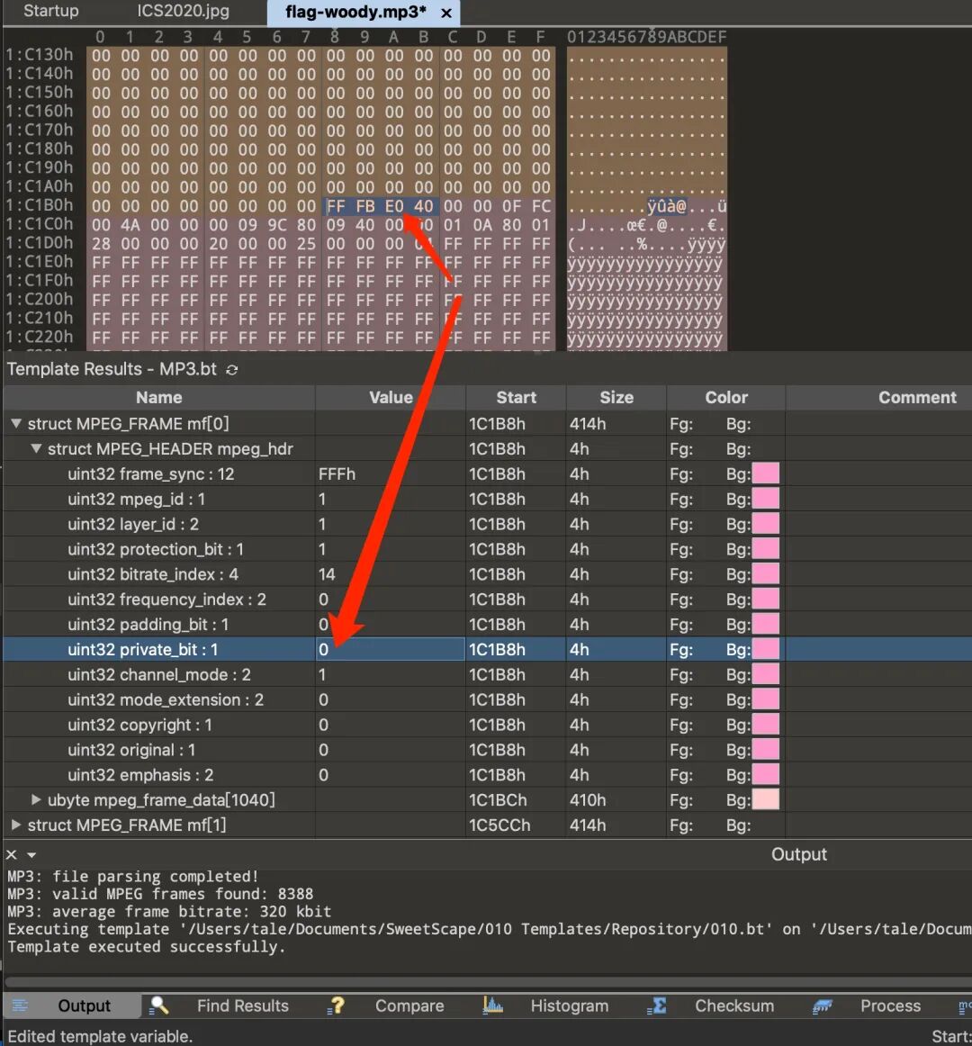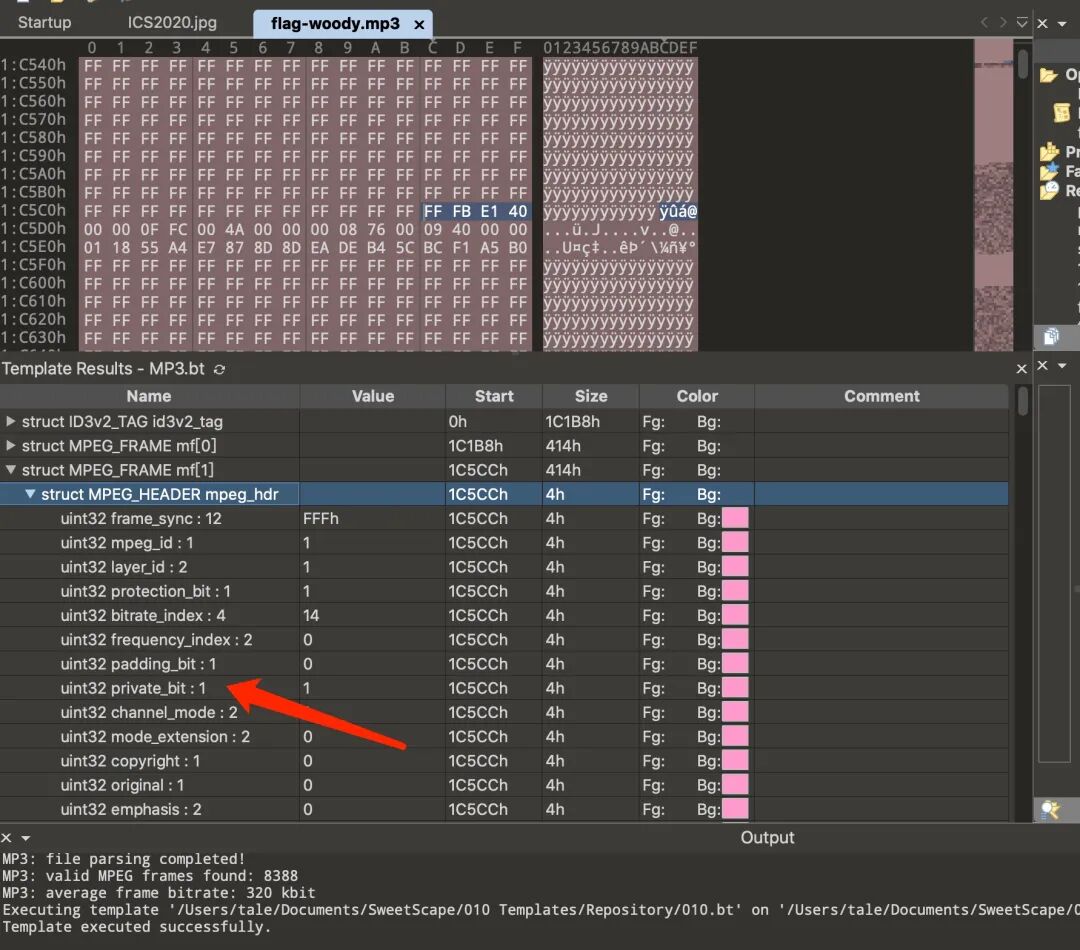 题目为mp3文件,因题目名为隐信道。并且mp3能正常播放。在不影响音频正常播放的前提下,能修改的地方也只有私有位private bit正常为0 将文件拖入010查看,发现私有位private bit存在为1的情况。