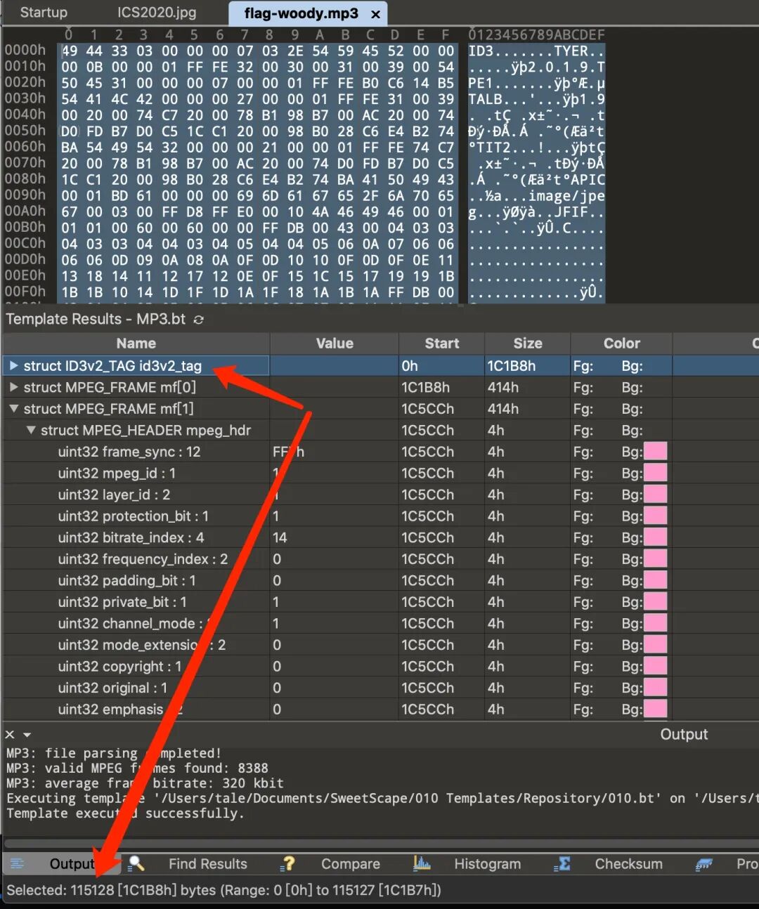将文件私有位进行提取 也就是FRAME中的mpeg_hdr中的private_bit 1、首先观察发现FRAME前面有一段数据,先将该数据删除 (选中会发现文件为115128bytes)