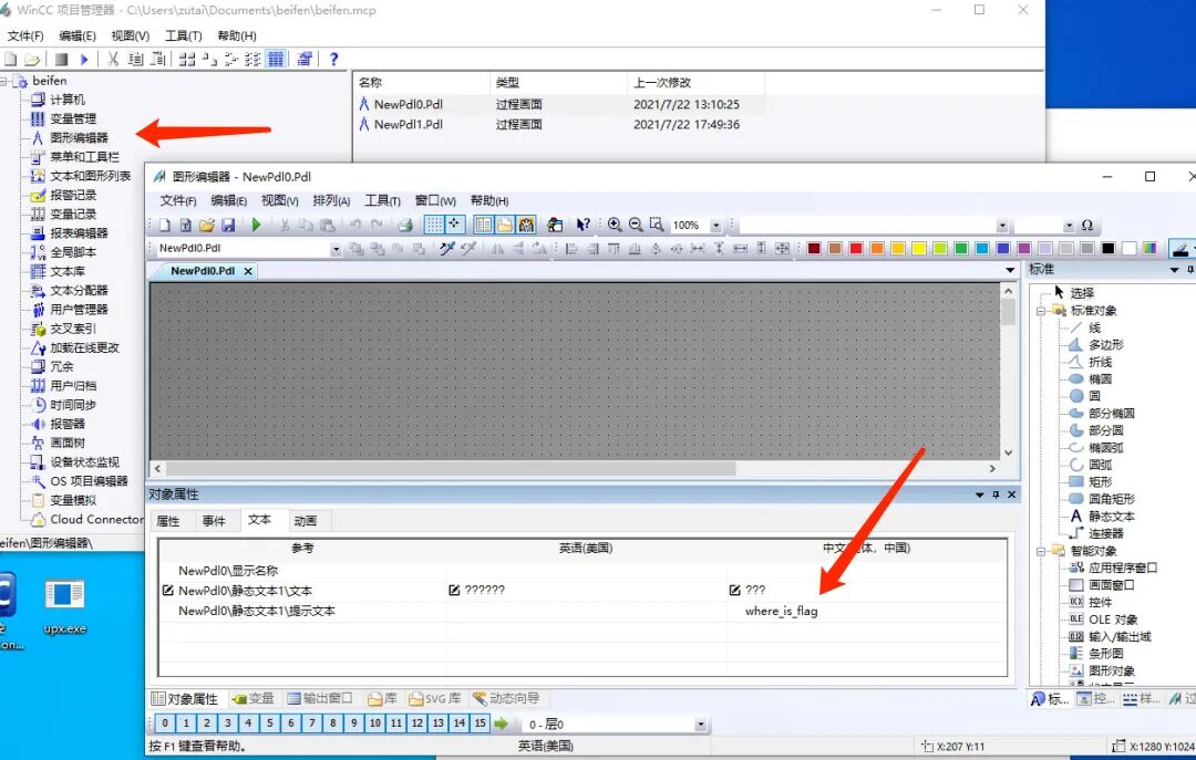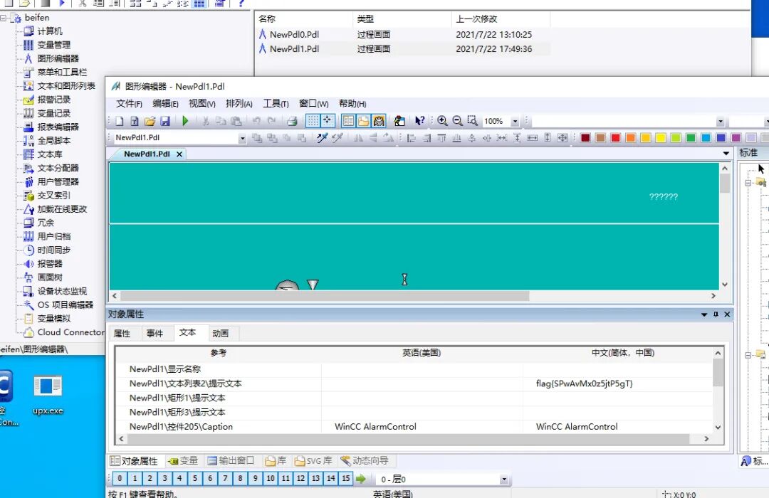 然后使用SIMATIC WinCC打开PDT后缀的文件 或者载入.mcp后缀文件 选择图形编辑器,发现文本栏有flag