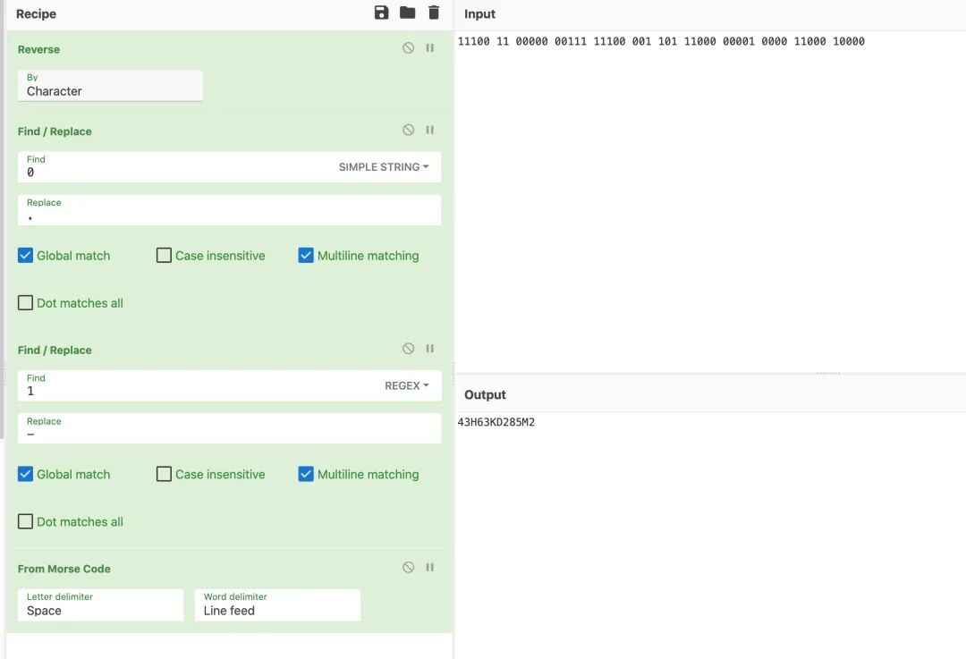 发现该字符串不对,后分析发现音频结尾的声音在最前面,猜测可能为倒序排列 转换为43H63KD285M2,发现也不对,改成小写字母提交正确