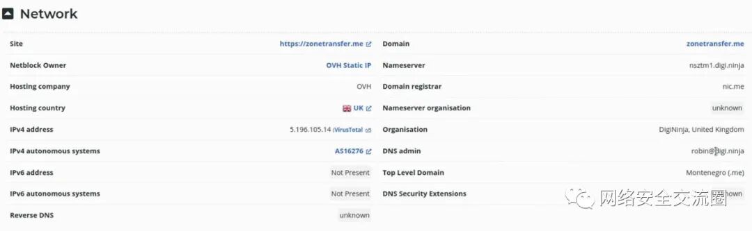 正如下面的屏幕截图中突出显示的,我们能够获得目标域的注册商,注册人,IP地址和托管信息。