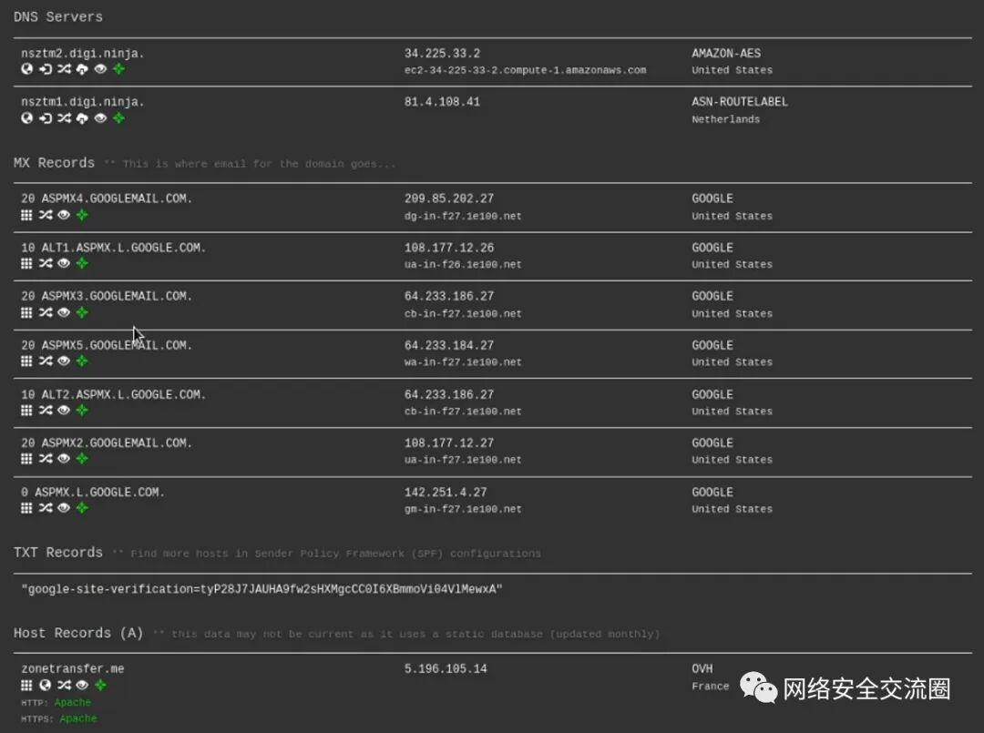 现在,我们已经能够识别目标域的IP地址,我们可以开始枚举目标域的DNS信息和记录。