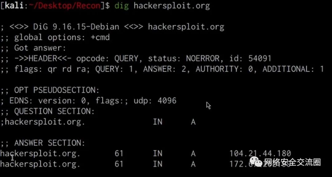 我们还可以利用DNS查找实用程序dig来识别目标域的IP地址和DNS记录,这可以通过运行以下命令来完成: