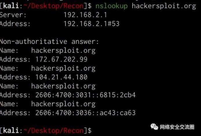 我们可以使用Nslookup实用程序来识别目标域的IP地址,这可以通过运行以下命令来完成: