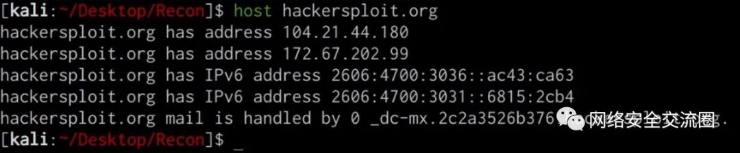 我们可以在Linux/Unix系统上使用host实用程序来确定目标域的IP地址,这可以通过在Kali Linux VM上运行以下命令来完成:将输出与目标域关联的所有相关IPV4和IPV6地址,如下面的屏幕截图中突出显示的。