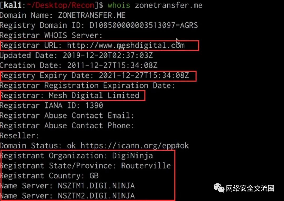 我们可以利用内置的whois查询实用程序来确定目标域的注册商,所有权和到期日期。这可以通过运行以下命令来完成: