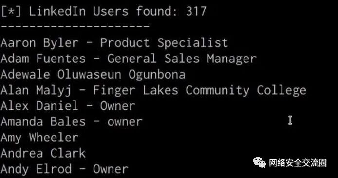 theHarvester预装在Kali Linux中,可以通过运行以下命令来识别公司的员工及其各自的电子邮件地址: