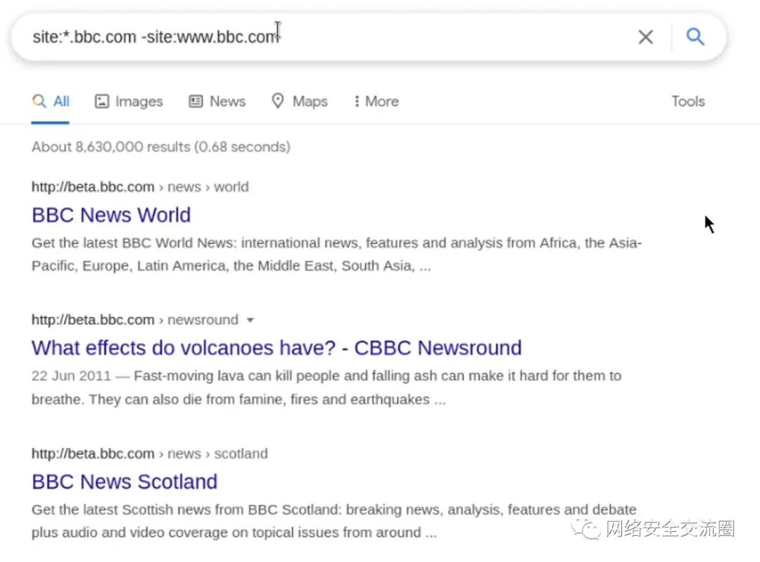 如下面的屏幕截图中突出显示的,前面的搜索词将搜索结果限制为仅TLD的子域。