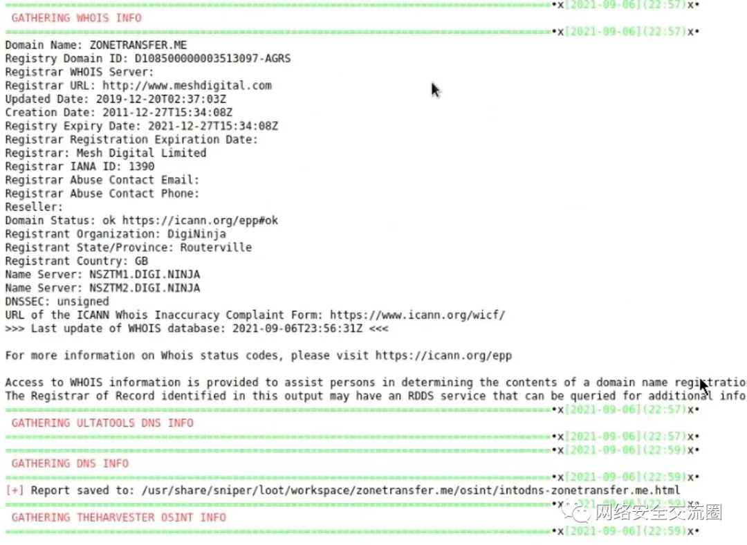 这将自动执行所有被动侦察技术,并将结果输出到保存在以下位置的报告中:/usr/share/sniper/loot/workspace/DOMAIN