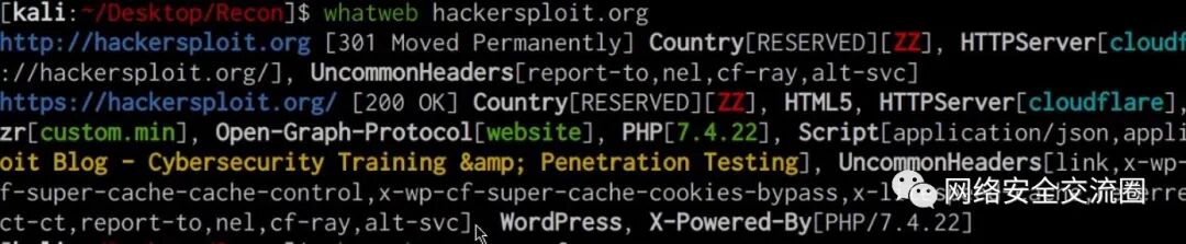 我们可以使用WhatWeb来发现目标域正在使用的Web技术和HTTP标头。WhatWeb命令行实用程序预装在Kali Linux中,可以通过运行以下命令来使用: