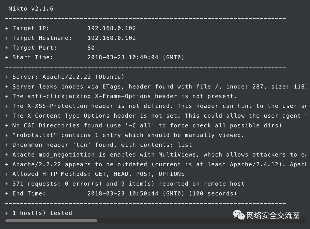 Nikto是一款免费的命令行漏洞扫描软件,可以扫描Web服务器中的危险文件/CGI,过时的服务器软件和其他问题。它执行一般和特定于服务器类型的检查。它还捕获并打印收到的任何cookie。通过运行以下命令,您可以使用Nikto扫描网站/Web服务器的漏洞:nikto -h https://domain.com