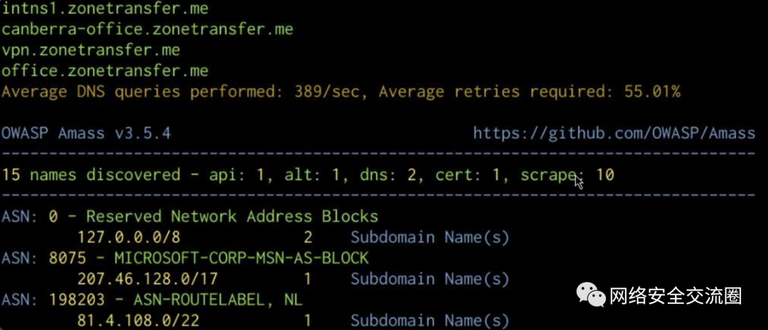 如下面的屏幕截图所示,Amass将输出子域和ASN的列表。