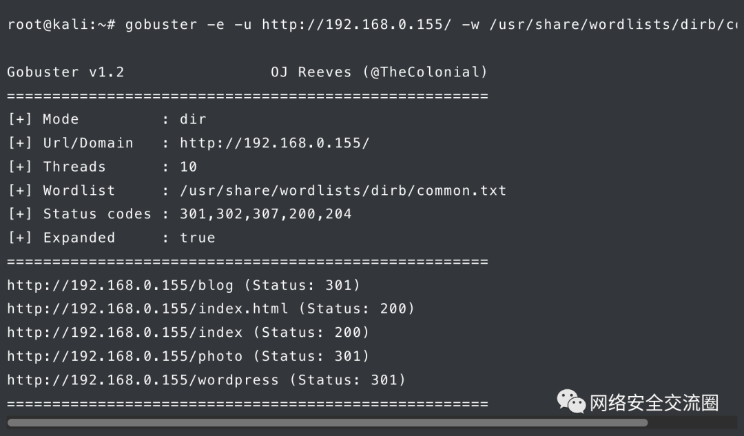 这将开始目录暴力攻击,并将隐藏的文件和目录被发现。