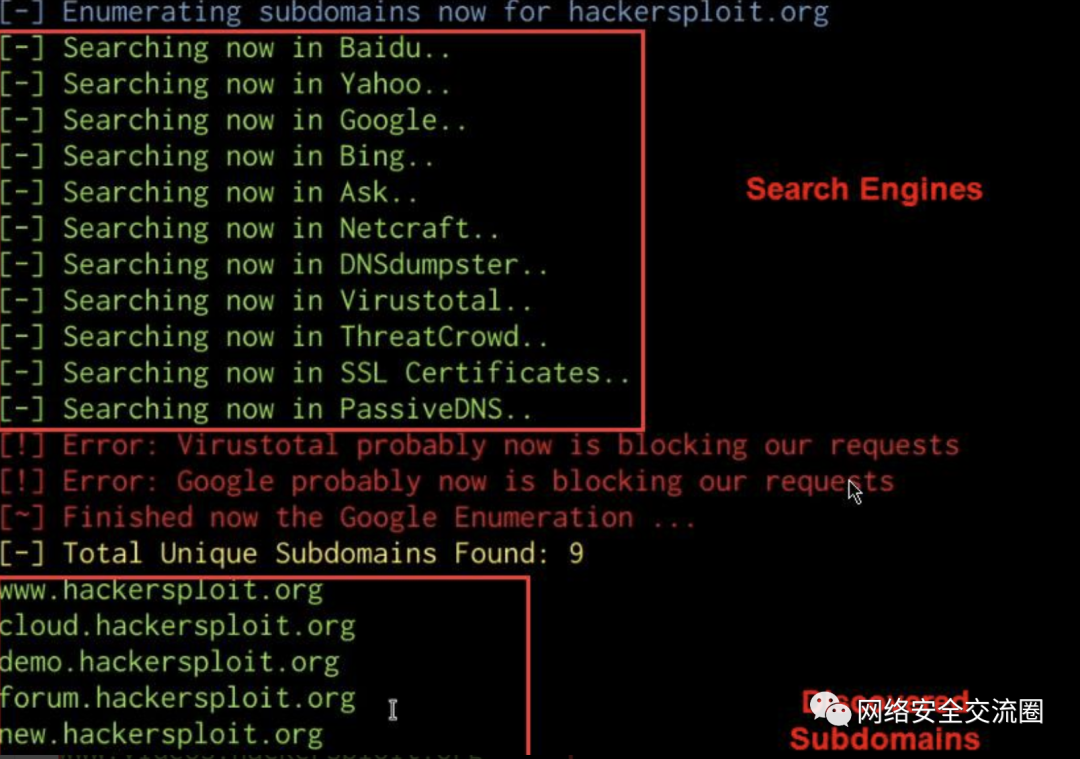 Sublist3r将通过利用各种搜索引擎和公开可用的数据库来枚举特定域的子域,这些数据库存储域和子域信息,如下面的屏幕截图所示。