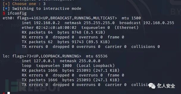 使用shiro工具命令执行ifconfig看看网段,一直回显不了,